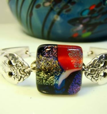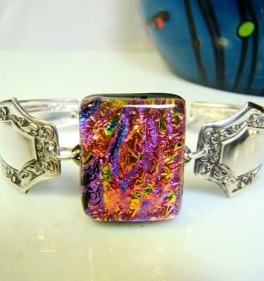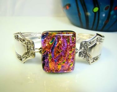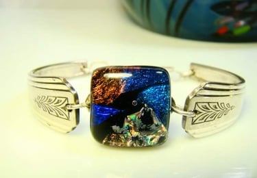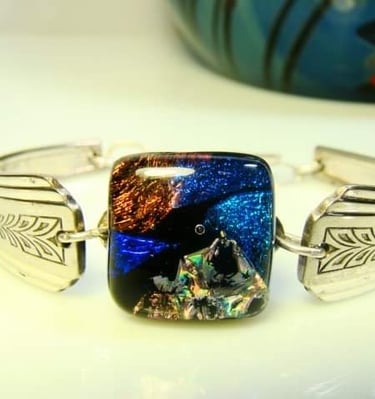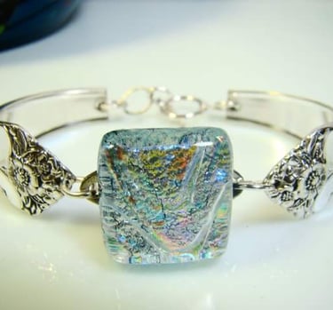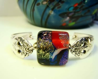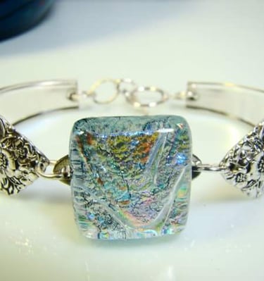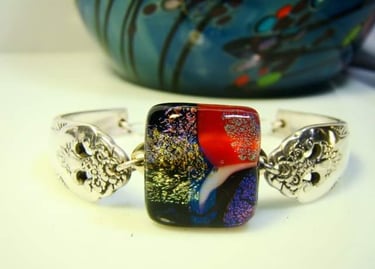 Discover jewelry crafted from antique flatware with fused glass or gemstones center pieces, where each piece tells its own story.